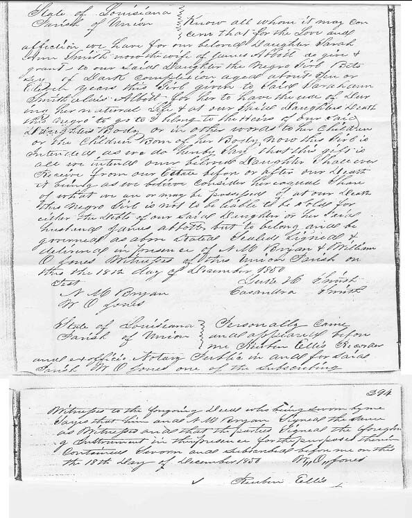 This is a conveyance of a little Negro girl, Bets, to Sarah Ann Smith Abbott (my great-grandmother), the daughter of Luke H. Smith and Casandra Mills from Bulloch Co, Georgia. The conveyance took place in Ouchita Parish, Louisiana in 1850 after Luke and Casandra left Georgia to make their home in Louisiana. I felt that this could be important information to someone who might be looking for the little girl, Bets, or any of the descendants of Luke and Casandra Smith.