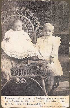 On the night of July 28, 1904, in a region of Bulloch County, Georgia, known as the Sink Hole, neighbors were alerted that the farmhouse of the Hodges family was on fire. Those who answered the alarm found blood on the gatepost, the tracks of four people in the lane that ran by the house (one of them barefoot), and, further on, an odd shoe cast aside, a bloody knife, and in what was left of the house, five burning, indistinguishable corpses-Henry Hodges, his wife Claudia, nine-year-old Kittie Corrine, two-year-old Harmon, and Talmadge, six months. By morning, "the entire population of Statesboro was at the scene, and hundreds from all portions of surrounding counties." The following day, July 30, all were buried in a single coffin at the Friendship Baptist Church.