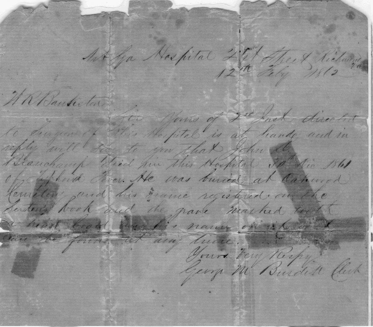 Sir, Yours of 2nd just directed to Surgeon of this Hospital is at hand and in reply will say to you that John D. Beauchamp died in this Hospital 30th Dec. 1861 of Typhoid Fever. He was buried at Oakwood Cemetery and his name registered on the Sexton's's book and the grave marked with a head board with his name on it and can be found at any time.