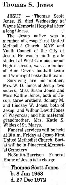 Jesup — Thomas Scott Jones, 15, died Wednesday at Wayne Memorial Hospital after a long illness.