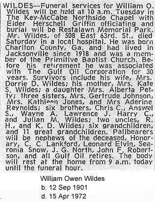 Wildes — Funeral services for William O. Wildes will be held at 10:00 a.m. Tuesday in the Key-McCabe Northside Chapel with Elder Herschell Griffin officiating and burial will be Restalawn Memorial Park. Mr. Wildes, of 508 East 63rd St., died Sayurday at a local hospital. He was born in Charlton County, Ga. and had lived in Jacksonville since 1918 and was a member of the primitive Baptist Church. Before his retirement he was associated with the Gulf Oil Corporation for 30 years. Survivors include his wife, Mrs. Dorrie D. Wildes,; his mother, Mrs. Kate S. Wildes; a daughter Mrs. Alberta Petry; three sisters, Mrs. Gertrude Johnson, Mrs. Kathleen Jones, amd Mrs. Aderine Reynolds; six brothers, Chris C., Answel S., Wayne A. Lawrence J. Harry C., and Julian M. Wildes; two uncles, R. H., and K. D. Wildes; six grandchildren and 11 great grandchildren. Pallbearers will be nephews of the deceased, Honorary, C. C. Lankford, Leonard Elvin, Searonia Snow, J. G. North, John F. Robertson and all Gulf Oil retires. The body will rest at the home from 9 a.m. today until the funeral hour.