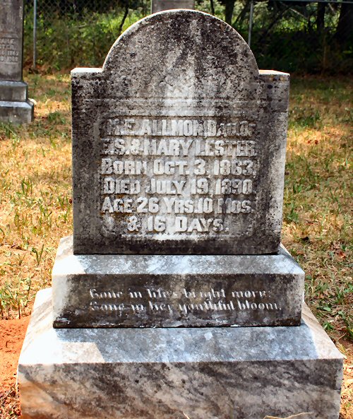 | Allmon | M.E. | Oct 3 1863 | Jul 19 1890 | d/o E.S. & Mary Lester Aged 26y 10m 16d |