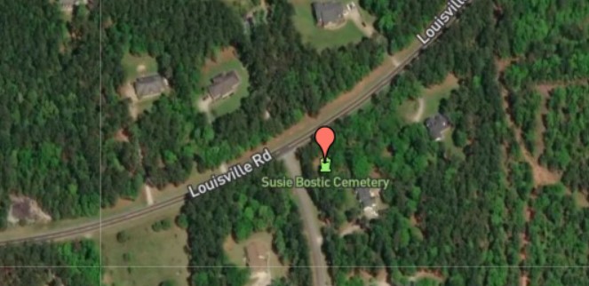 There are no identifiable headstones in this cemetery. The cemetery area is clearly bordered by a granite boulder wall that is about 2 feet tall. Within the cemetery, there is only 1 possible headstone, with no engraving on the headstone. The Columbia County Assessors Office shows this parcel as a cemetery and it is in the correct location. Susie nee Avery Bostic was born abt 1884 Georgia; Her parents were Irene Williams & George Avery. This is most-likely where she is buried. In the 1900 census, Yrean Williams 40 mother, Sousan H Williams 17 (May 1883) self, Monk Williams 15 sister, Money Williams 13 sister, Boon Williams 11 sister, John Green 16 Servant According to the 1910 census, her family was living in Militia District 126, and was Mendon Bostick 38 husband, Susie Bostick 25 self, Corean Bostick 8 Daughter. Amada Bostick 6 Daughter, Evans Bostick 4 Son, Maudell Bostick 3 Daughter, Irene Bostick 2 Daughter, Mattie L Bostick 0 Daughter, Orella Williams 19 Sister, Loie Hammonds 20 Cousin of husband. In the 1920 census, her family lived in Kiokee and was Menda Bostic 49 Head, Susie Bostic 36 self, Boston Bostic 22 Son, Cora Bostic 17 Daughter, Noisy Bostic 15 Daughter, Evens Bostic 13 Son, Mandell Bostic 12 Daughter, Irene Bostic 11 Daughter, Mattie Lue Bostic 9 Daughter, Olive Bostic 7 Son, Ethel Bostic 14 stepdaughter In the 1930 census, her family lived in Kiokee, and was Menda Bostic 58 husband, Susie Bostic 46 self, Maudelle Bostic 23 Daughter, Irene Avery 62 Mother, Ove Henderson 8 Grandson, Robert Holmes 7 Grandson, Louise Holmes 6 Granddaughter. Oliver Thomas 17 Nephew. In the 1940 census, her family lived on Old Petersburg Road, Kiokee and was Susie Bostick 56 self widow, O V Henderson 18 Grandson. She was a mid-wife. There is no documentation of Susie after 1940. Her husband Mendon Bostick 1872 - 1 Dec 1936 buried Heggie-Evans Cemetery Appling. |