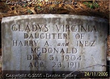 GLADYS VIRGINIA MCDONALD 5 DEC 1904 - 29 AUG 1911 DAUGHTER OF HARRY A. & INEZ GRIFFIN MCDONALD