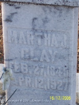 MARTHA J. CLAY 27 FEB 1840 - 12 APR 1927 WIFE OF DAVID H. CLAY MARRIED: 23 MAR 1876 IN DECATUR CO., GA BOOK B, PAGE # 230
