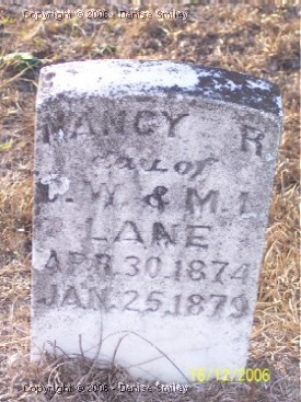NANCY R. LANE 30 APR 1874 - 25 JAN 1879 DAUGHTER OF D. W. & M. L. LANE