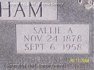 SALLIE A. DURHAM 24 NOV 1878 - 6 SEP 1958 WIFE OF JOHN W. DURHAM