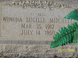 WINONA LUCILLE MITCHELL 25 MAR 1912 - 14 JUL 1960 WIFE OF JAMES A. MITCHELL MARRIED: 15 MAY 1927 IN DECATUR CO., GA BOOK J, PAGE # 198