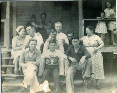 This picture was made about 1938. It shows John and Clifford Webb and 7 of their children on the steps of the family home in Jakin. The