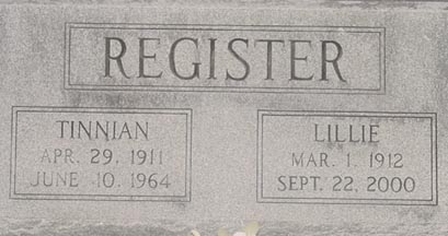 REGISTER, Lillie - 1 Mar 1912 - 22 Sept 2000