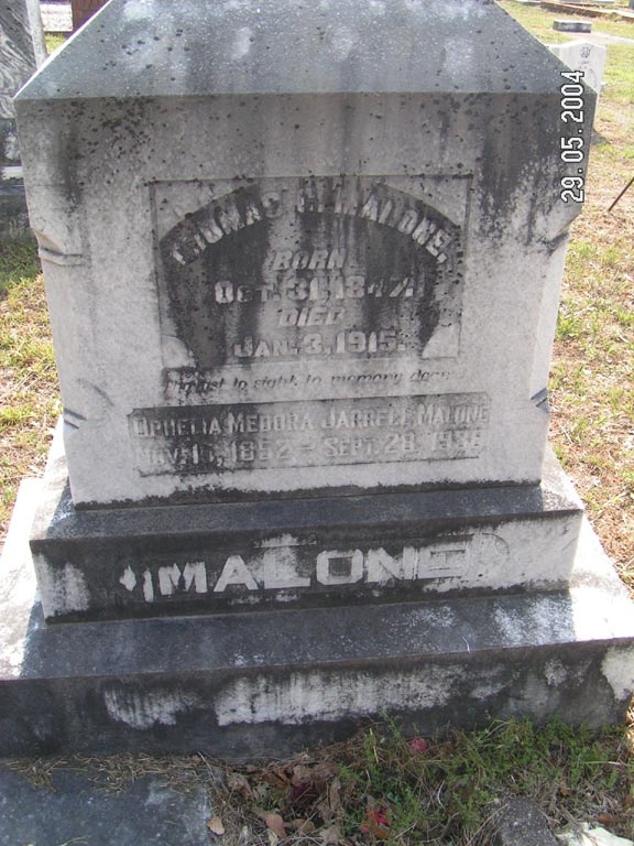 ![]() Thomas C. Malone Born Oct 31, 1847 Died Jan 3, 1915 Ophelia Medora Jarrell Malone Nov 1?, 1852 Sept 28, 1??? |