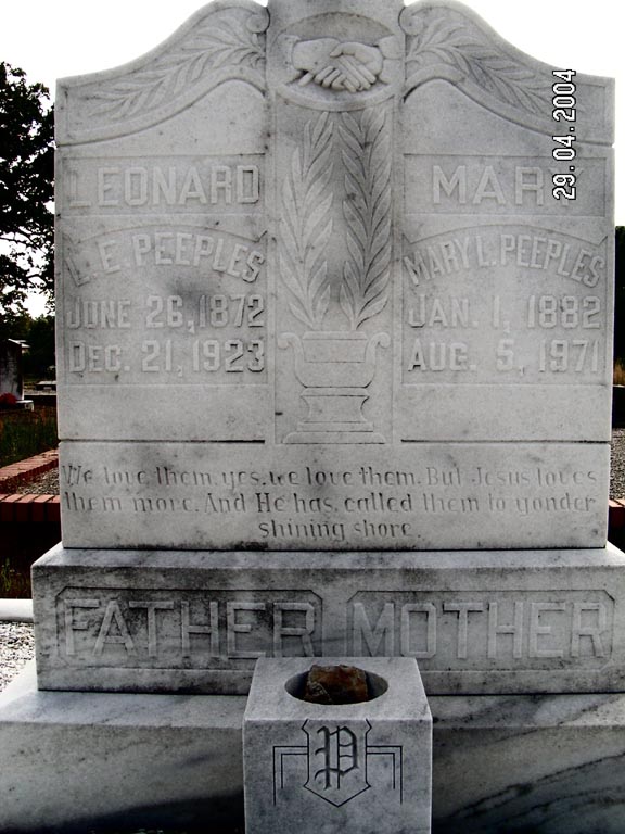 ![]() Leonard L. E. Peeples June 26, 1872 Dec 21, 1923 Mary Mary L. Peeples Jan 1, 1882 Aug 5, 1971 Father, Mother We love them, yes we love them. But Jesus loves them more. He has called them to yonder shining shore. |