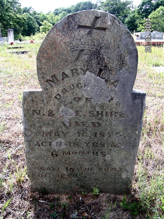 ![]() Mary L. A. Shire Daughter of N. & S. E. Shire Died May 16, 1875 Aged 18 years and 6 months Safe in the Arms of Jesus |