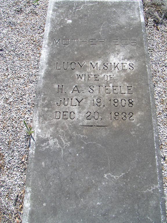 ![]() Mother Bob Lucy A. Sikes, Wife of H. A. Steele July 19, 1908 Dec 20, 1932 |
