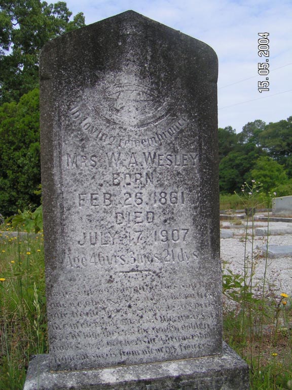 ![]() Mrs. W. A. Wesley Born Feb 26, 1861 Died July 17, 1907 Age 46 years, 3 months, 21 days |