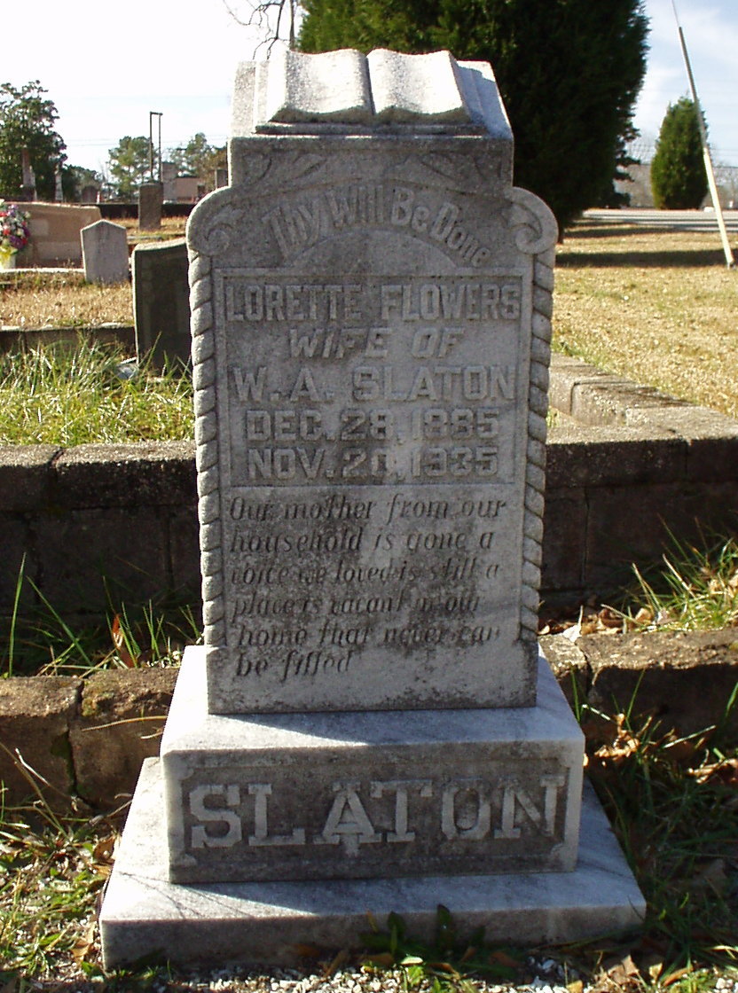 Lorette Flowers, Wife of W. A. Slaton b. 28 Dec 1885 d. 20 Nov 1935 |