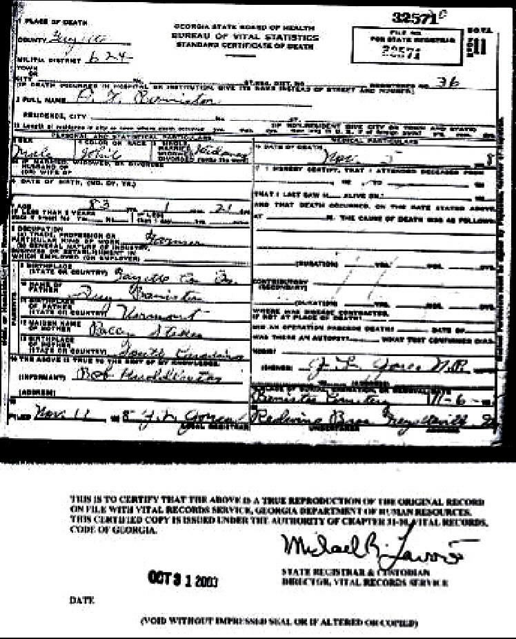 Obediah Thatcher Bannister - 1920 Death Certificate
