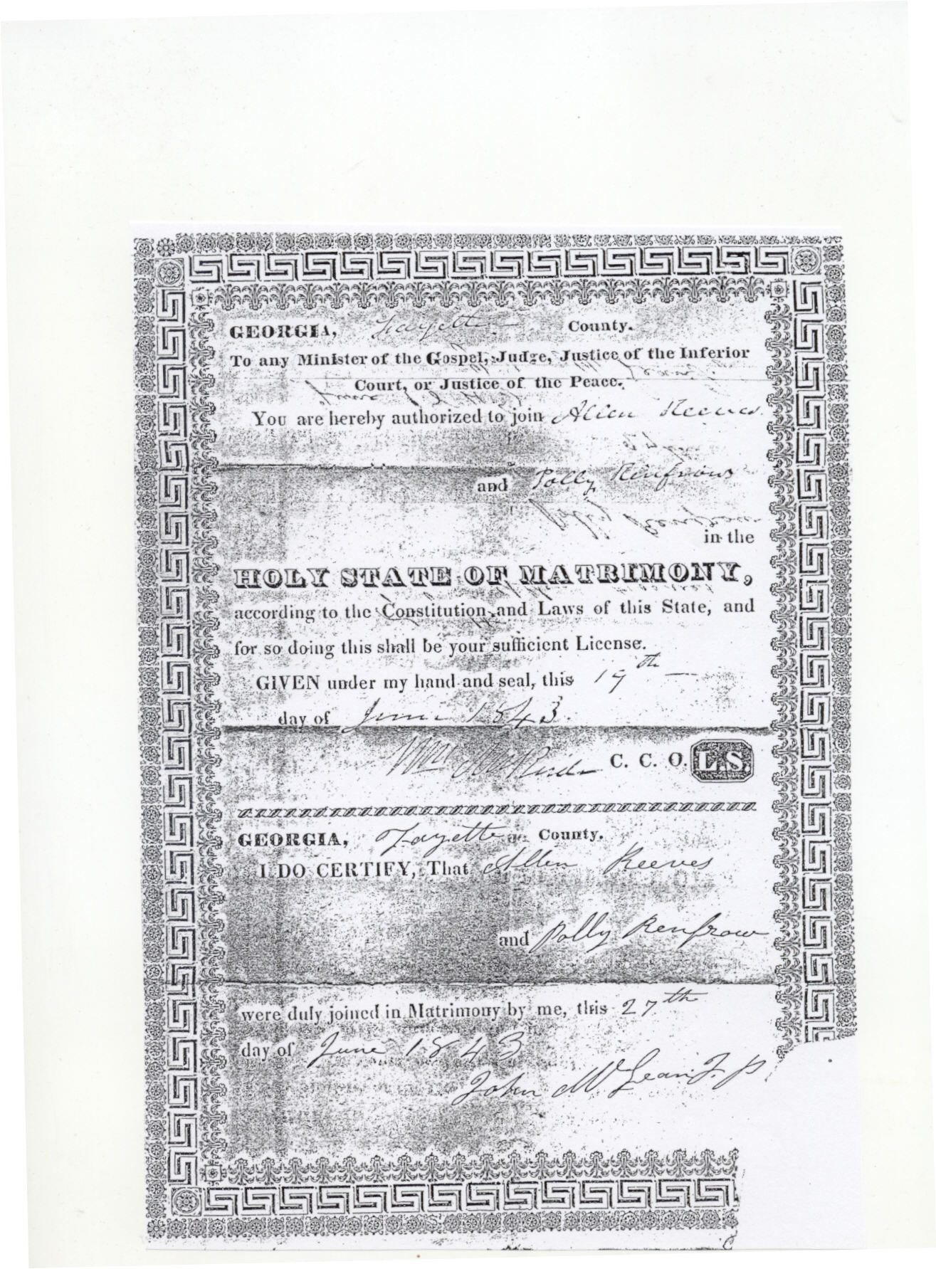 I Do Certify, That Allen Reeves and Polly Renfrow were duly joined in Matrimony by me, this 27th day of June 1843.