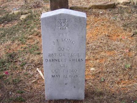 PVT J. F. Long CO C 21st GA REGT Dabney's Rifles CSA October 7, 1840 May 22, 1925 |