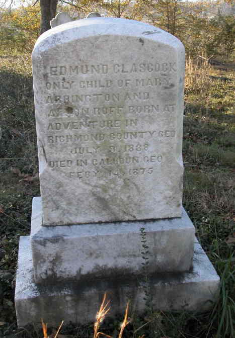 Edmund Glascock only child of Mary Arbington and A--on Roff born at Adventure in Richmond County, Georgia July 9, 1838 Died in Calhoun, Georgia February 14, 1875 |
