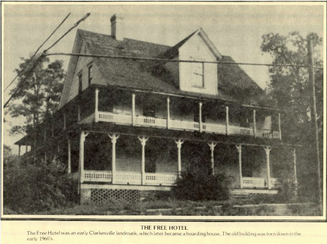 The Free Hotel The Free Hotel was an early Clarkesville landmark, which later became a boarding house. The old building was torn down in the early 1960's. Submitted by G. C. Oliver |