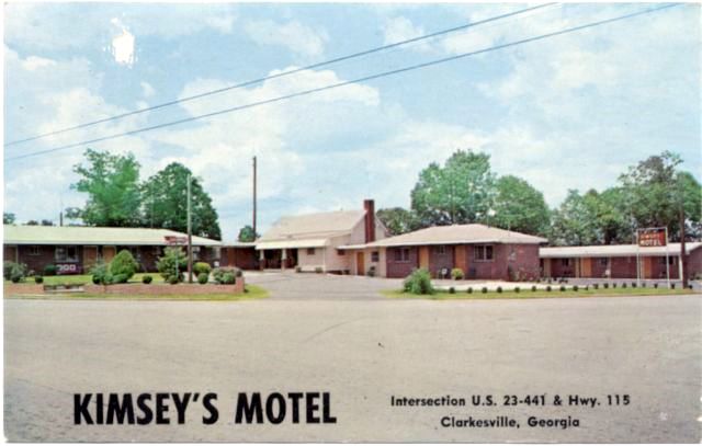 Kimsey's Motel, Clarkesville, Ga. 1960's Next door to Hill's Restaurant. Located in the foothills of the North Georgia Mountains, Georgia's best fishing lakes nearby. 16 units all with air conditioning, T. V., electric heat. Open year 'round. Submitted by Linda Blum-Barton |