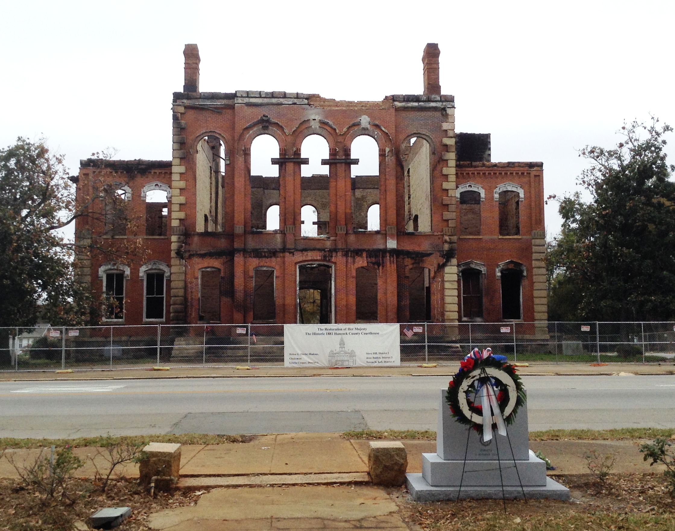 Memorial Square Monument with view of ruins of Hancock County Courthouse