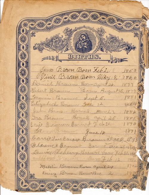 Deaths: James Brown died Apr 9, 1917; Milvinie Brown died 17 Mar 1932; Melvin Brown died Aug 16, 1902; Daniel Brown died Oct 1932; Joseph M Brown Sept 16, 1943. |