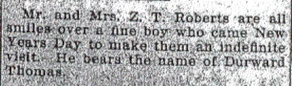 Young Durward Thomas Roberts was born at 10:00 AM on January 1, 1915 the third of five children and the older of two boys of Zephaniah Thomas and Bessie Lee Simmons Roberts. All of their children except the youngest daughter were born in the Roberts family farmhouse in Jasper Co, GA about one and one half miles west of Monticello. My grandmother Bessie Mama named my father after her oldest brother William Durward Simmons in honor of her brother’s accomplishments as a merchant in Mississippi.22 My father received his father’s middle name. The following appeared in the Monticello News on January 8, 1915. As a young child Durward Roberts lived and played on his family farm. At the age of seven after his grandfather