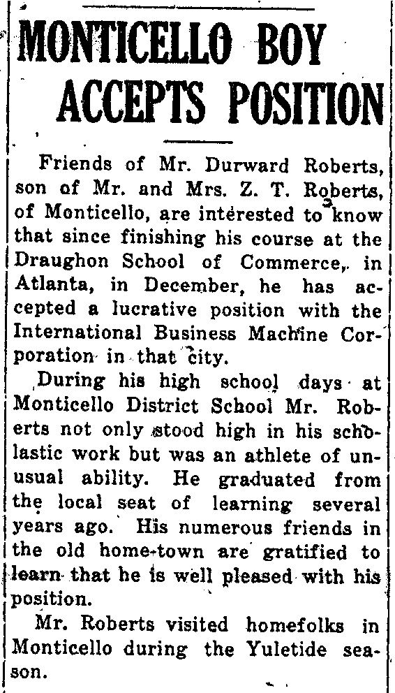 Durward Roberts graduated on May 23, 1932 from Monticello High School along with 34 other seniors including only 12 boys.79 It appears many boys his age decided to go to work rather than finish high school. He chose not to go to college or business school like some of his class mates because he felt he was not ready to study hard enough and might flunk out; therefore, he went to work for his father at Farmers Milling Company. I am sure money was tight and his father could use the help in the mill. The mill, located across the street from the family home, ground grain into flour. He worked hard at the mill for four years, and he later told me that his father greatly appreciated his efforts. Being an ambitious young man and realizing there were few opportunities during the depression for him in Monticello, he decided to get an education in order to obtain a job with a large growing company. His younger brother Jabus attended Draughon School of Commerce in Atlanta in 1936. The school trained its students in accounting, bookkeeping, commerce, penmanship, shorthand and typewriting.80 His brother must have been happy with the school; therefore, in late 1936 or early 1937 my father left Monticello to attend Draughon. He had saved enough money to pay for his entire education. My father spent approximately one year mastering these skills and could type over 100 words per minute with little or no errors. An article of congratulations on his graduation from the school appeared in the Monticello News on January 6, 1938.
