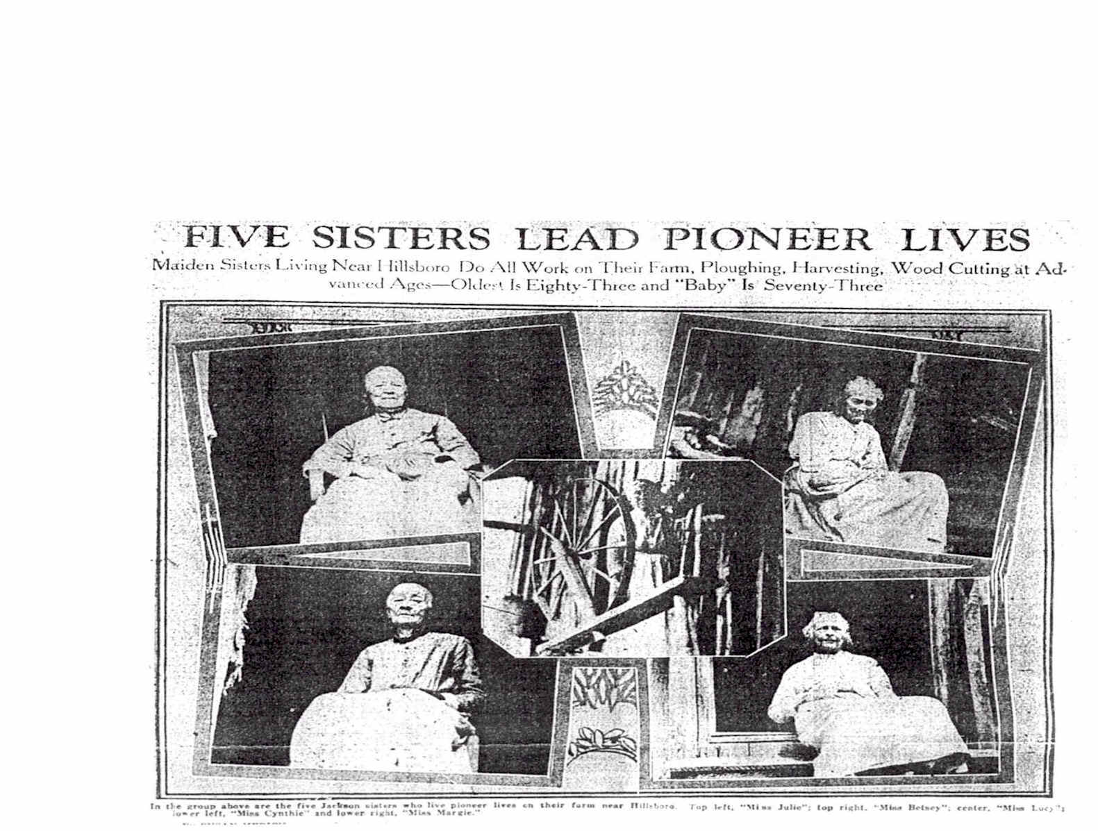 "This is the day of equal rights, but there are few women who really want the right and privileges enjoyed by the "Jackson Girls", five maiden sisters, who live near Hillsboro and who have done all the ploughing, rail splitting, harvesting, planting, wood cutting and stock feeding, as well as the milking, cooking and washing, for many years. Just how many it is hard to say, for since their father "went away" to the Civil War, there has not been a man on the place.