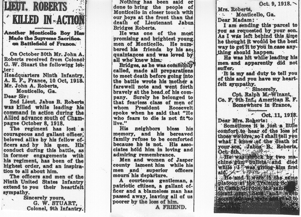 I do not believe my great grandfather could read. He enjoyed attending functions such as county fairs and liked to have a drink at times according to his granddaughter Martha Lois. His youngest son Bridges died in France during World War 1 in 1918, and my great grandfather never fully recovered from his son's death. According to John A. Roberts’ death certificate he became ill in early 1920 and died from heart disease in 1921. During the time of his illness several of his out-of-town relatives visited him on his farm.21 His will is on file in Will Book #15 p160 at the Jasper County courthouse. He left everything to his wife and named his son Z.T. executor of the estate. The family buried him in West View Cemetery in Monticello, GA.