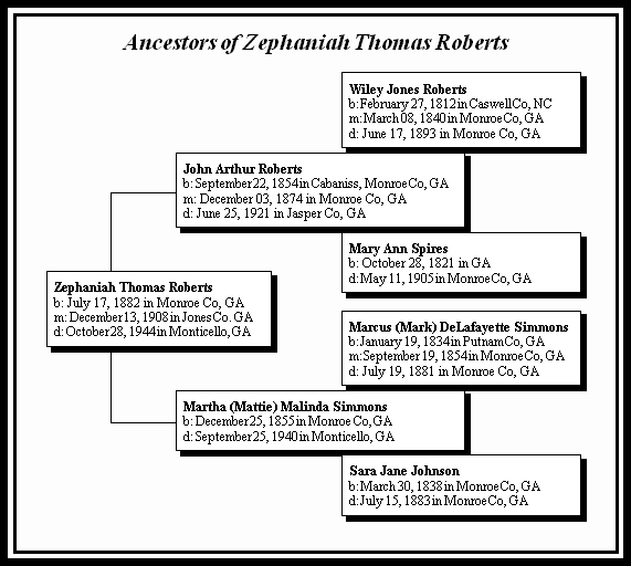 John Arthur Roberts, born September 22, 1854 in Cabaniss, Monroe Co, GA; died June 25, 1921 in Jasper Co, GA. He was the son of Wiley Jones Roberts and Mary Ann Spires. He married Martha (Mattie) Malinda Simmons December 03, 1874 in Monroe Co, GA. She was born December 25, 1855 in Monroe Co, GA, and died September 25, 1940 in Monticello, GA. She was the daughter of Marcus (Mark) DeLafayette Simmons and Sara Jane Johnson.