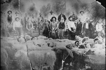 Group of men gathered for sheep shearing held on the farm of the Norris family which was located