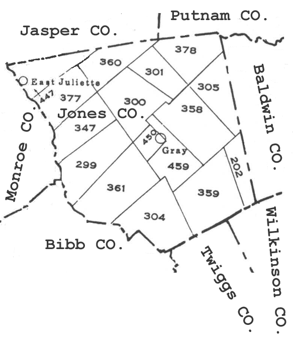 GMD 202 GMD 299 GMD 300 - Round Oak (south) GMD 301 GMD 304 - Permenter GMD 305 Hansford - 1816 GMD 347 GMD 358 - Jefferson 1816 GMD 359 - Wallers 1816 GMD 360 - Round Oak (north), Oconee GMD 361 GMD 377 - Caney Creek, Chattahoochee GMD 378 - Green 1816 GMD 447 - East Juliette GMD 450 - Gray, Clinton GMD 459