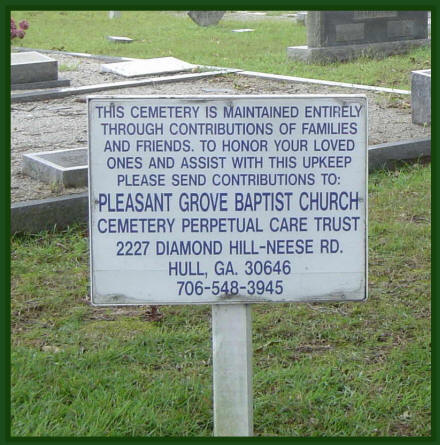 Directions From Athens, GA, travel north on US Hwy 29. Just inside Madison County, there will be a bank and Ingles food store on the right. Directly ahead is a traffic light. Turn left at this traffic light. At the next intersection, turn right onto Hwy 106. Travel on Hwy 106 for 1.5 - 2.0 miles to the Neese community. You will pass the Jackson Electric Co-op on the left. Begin watching for an intersection at the top of the next rise in the road. The section of the road that crosses Hwy 106 to the right is Diamond Hill Neese Rd. Turn right onto this road. You will see the church ahead on the right. The cemetery is on the far side of the church. Parking is available at the church, and the drive through the cemetery can be accessed by exiting the parking lot to the left of the church. If you are traveling south from Danielsville on Hwy 29, watch for Moon's Grove Rd. on the right about 4.0 mi. outside of Danielsville. Once you pass Moon's Grove Rd., you will pass the community ball field on the right. Watch for a convenience store on the left, and turn right at the road that is just past the store. This is the Diamond Hill Neese Rd. Pleasant Grove Baptist Church will be at the other end of this road (about 2 mi.).