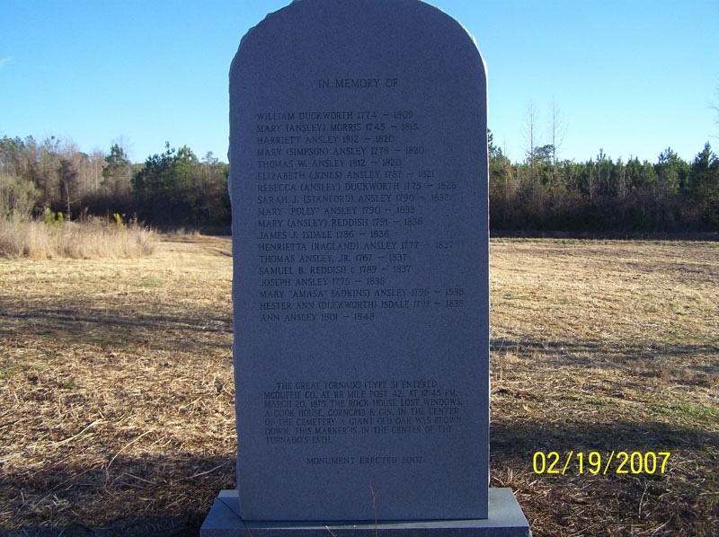 This cemetery is located across and down the road from the Historic Rock House. The memorial is is erected on the site of an old oak tree that was uprooted during the catastrophic tornado of 1875