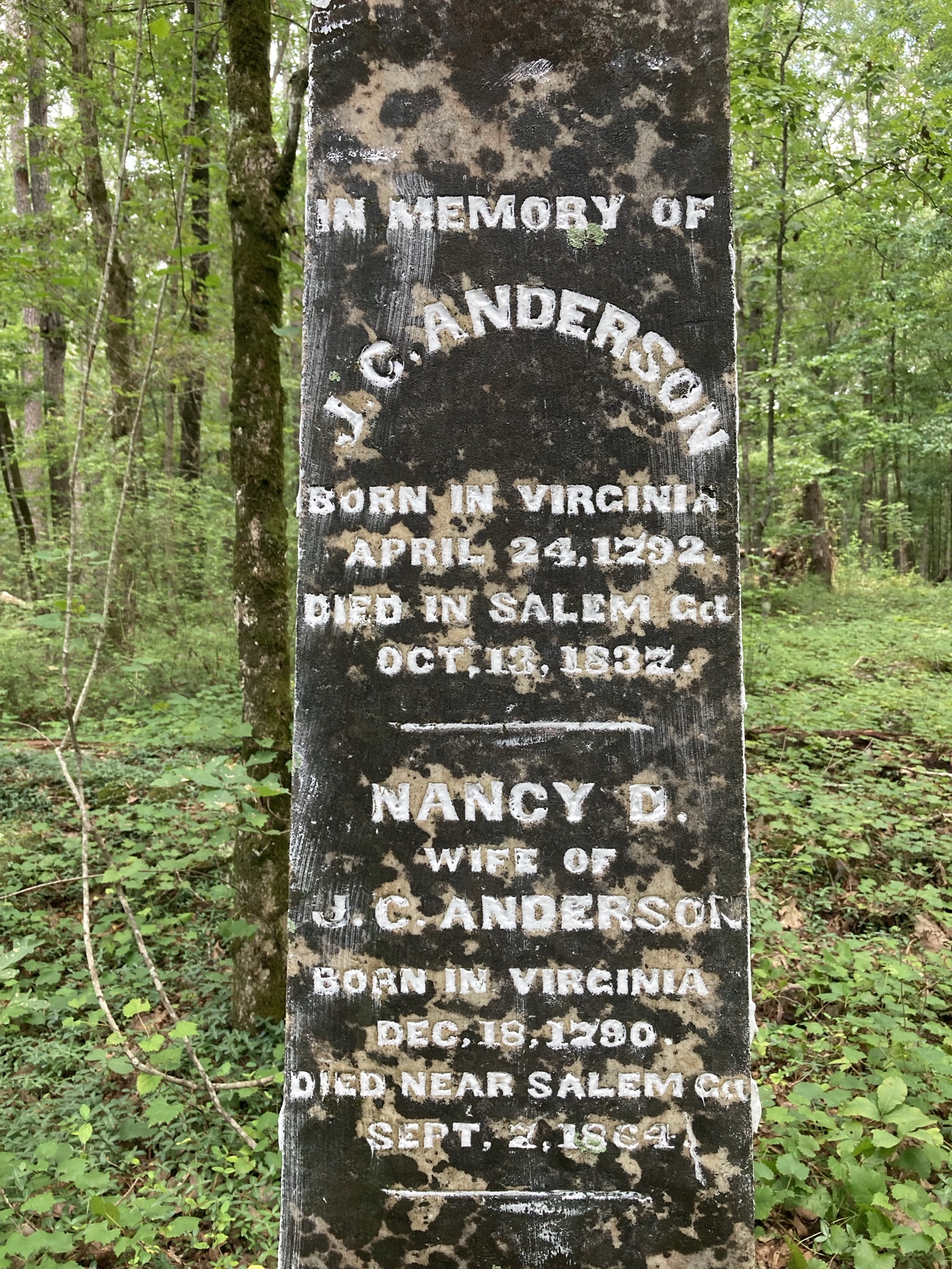 | Anderson | Nancy D. | Dec. 18, 1790 | Sep 7, 1864 | w/o J.C., b. in VA d. in Salem |