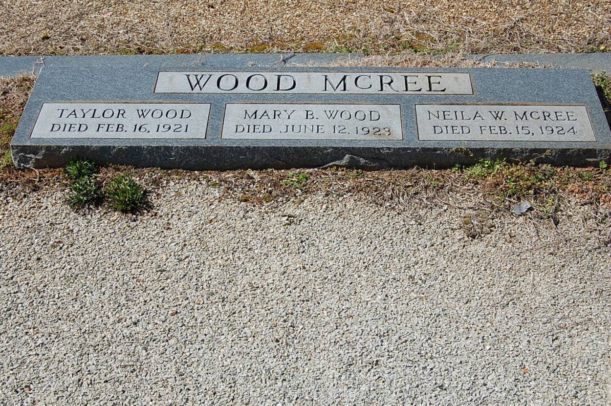 | Wood | Taylor | Feb 16 1921 | shared stone w/Mary B. Wood & Neila W. McRee | |