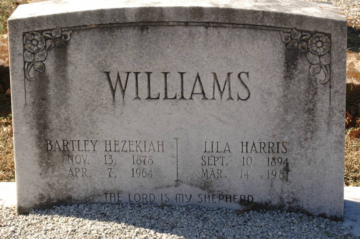 | Williams | Lila Harris | Sep 10 1894 | Mar 14 1981 | shared stone w/Bartley H. |