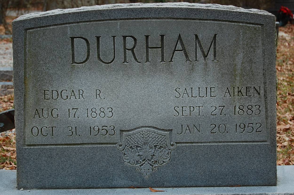 | Durham | Edgar R. | Aug 17 1883 | Oct 31 1953 | shared stone w/Sallie A. |