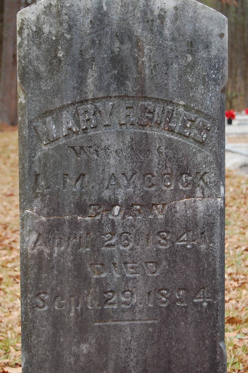 | Aycock | Mary F. Giles | Apr 26 1841 | Sep 29 1894 | w/o I.M. |