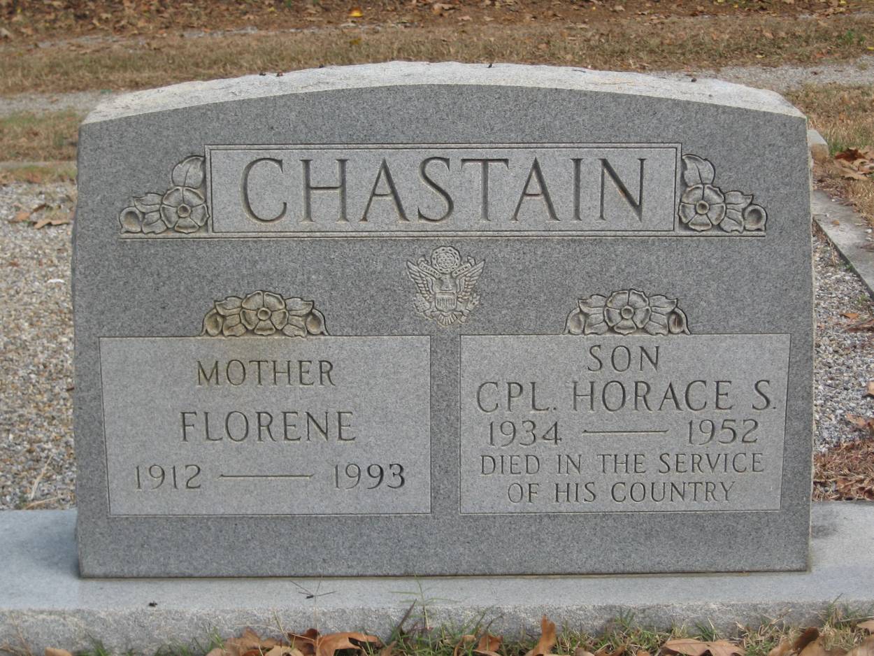 | Chastain | Horace S. (Cpl.) | 1934 | 1952 | "Died in the service to his country", shared stone w/Florene |
