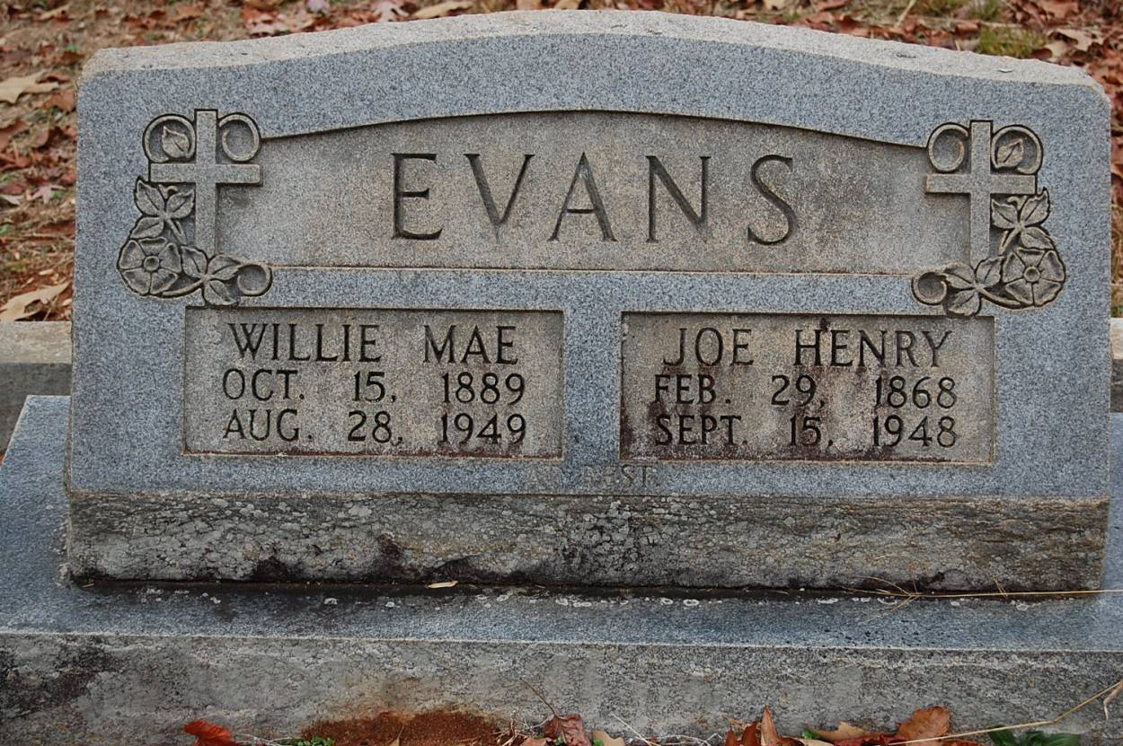| Evans | Joe Henry | Feb 29 1868 | Sep 15 1948 | shared stone w/Willie M. |