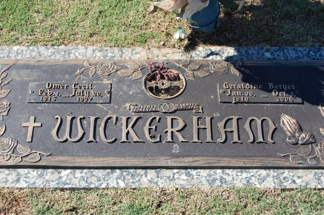 | Wickerham | Omer Cecil | Feb 1 1915 | Jul 20 1997 | shared stone w/Geraldine , m. Jun 27 1940 |
