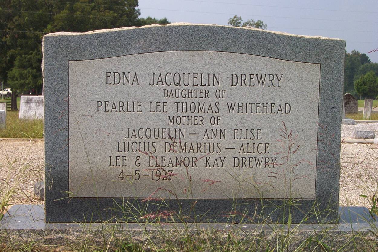 | Drewry | Edna Jacquelin | Apr 5 1927 | d/o Pearlie Lee Thomas Whitehead, mother of Jacquelin, Amelise, Lucius Demarius, Alice Lee & Eleanor Kay | |