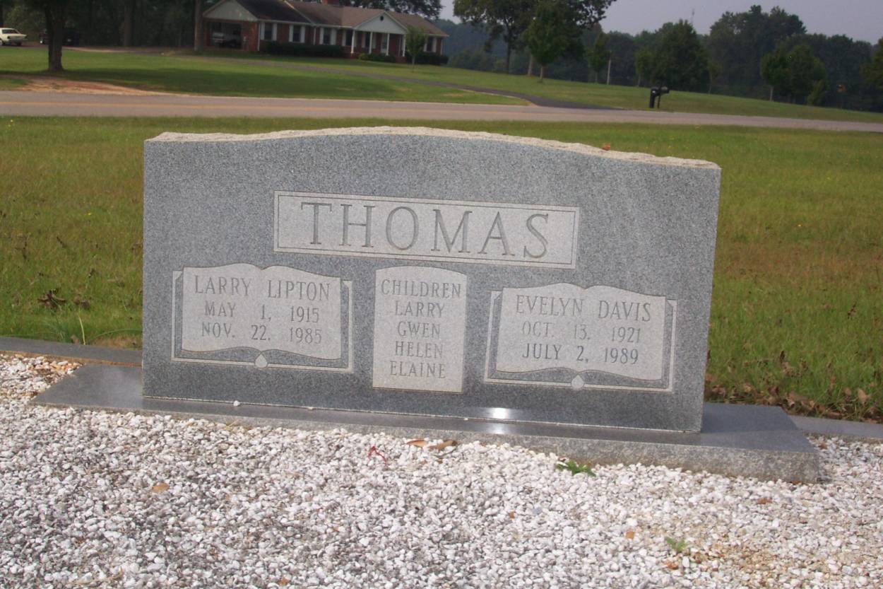 | Thomas | Evelyn Davis | Oct 13 1921 | Jul 2 1989 | m/o Larry, Gwen, Helen & Elaine, shared stone w/Larry L. |