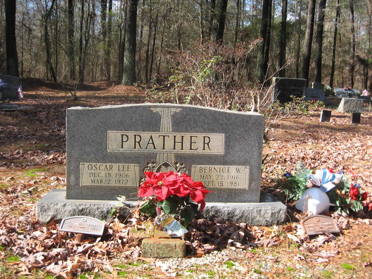 | Prather | Oscar Lee | Dec 18 1906 | Mar 2 1972 | shared stone w/Bernice W. |