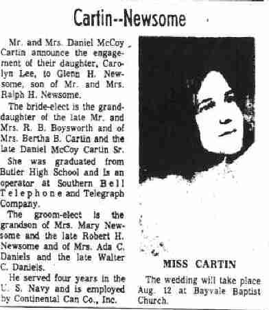 | CARTIN-NEWSOME | Marriage Notice | Pg. 6D | 02 Jul 1967 | Beth Boysworth HEMINGWAY |