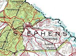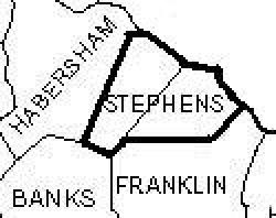 Eight other counties were formed on the same day, and the Atlanta Constitution included descriptions of the bills for each county. The following excerpt describes Stephens County: "The Stephens County bill was introduced by Mr. Perry, of (?), and it provides that the county be made up of parts of Habersham and Franklin counties. The county seat will be Toccoa, and it will be attached to the northeastern judicial court and ninth congressional district. Its superior court will meet on the first Monday in May and November of each year. Many prominent citizens of Toccoa took part in the campaign for this county, and were ably assisted by citizens in the surrounding country. Yesterday at high noon, when Governor Terrell signed the bill creating this county, there were present Dr. Jeff Davis, chairman of the new county committee, Mrs. Jeff Davis, Colonel F. Barrett and Mrs. Barrett, and Mrs. R. W. Yow" Map of present day Stephens County